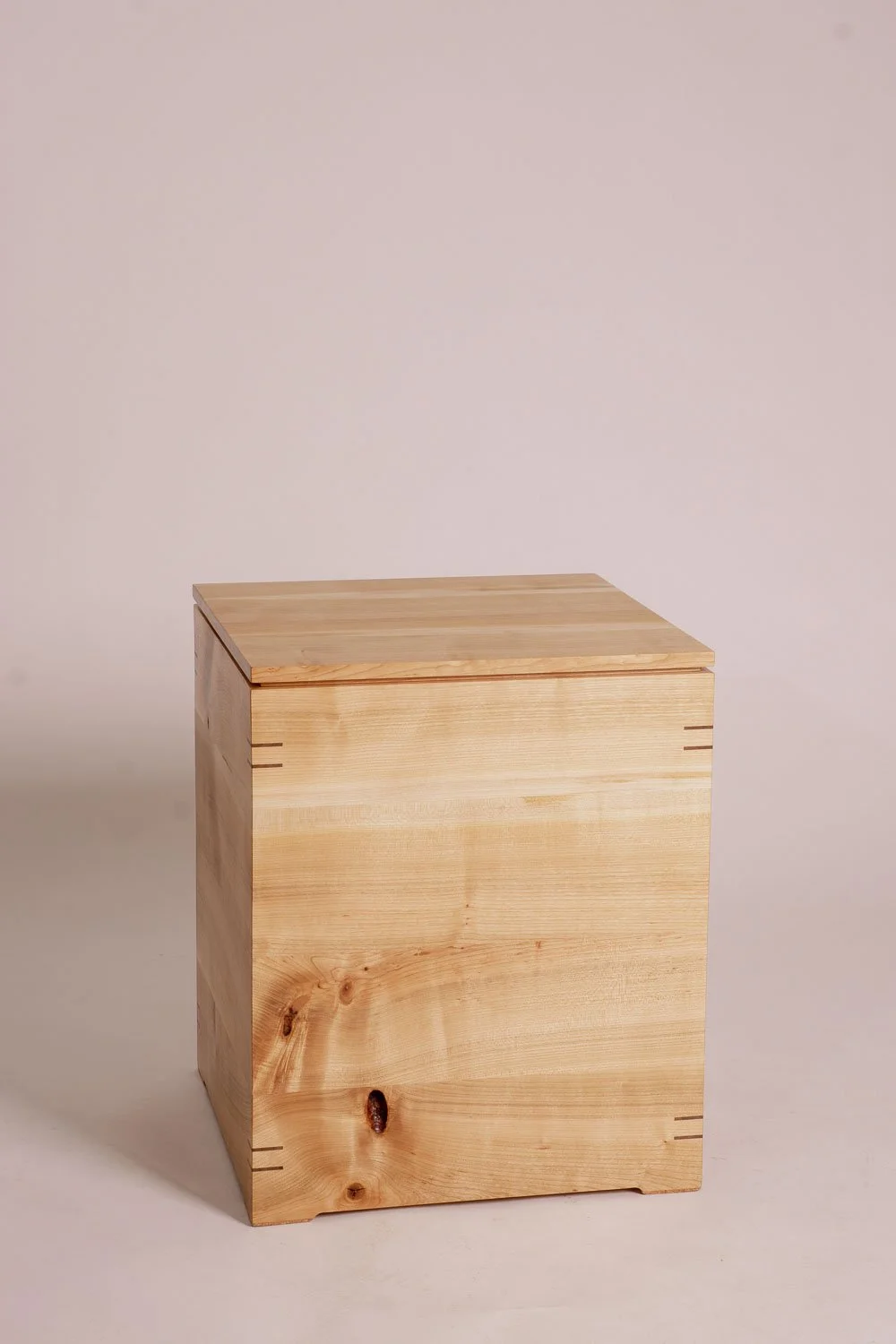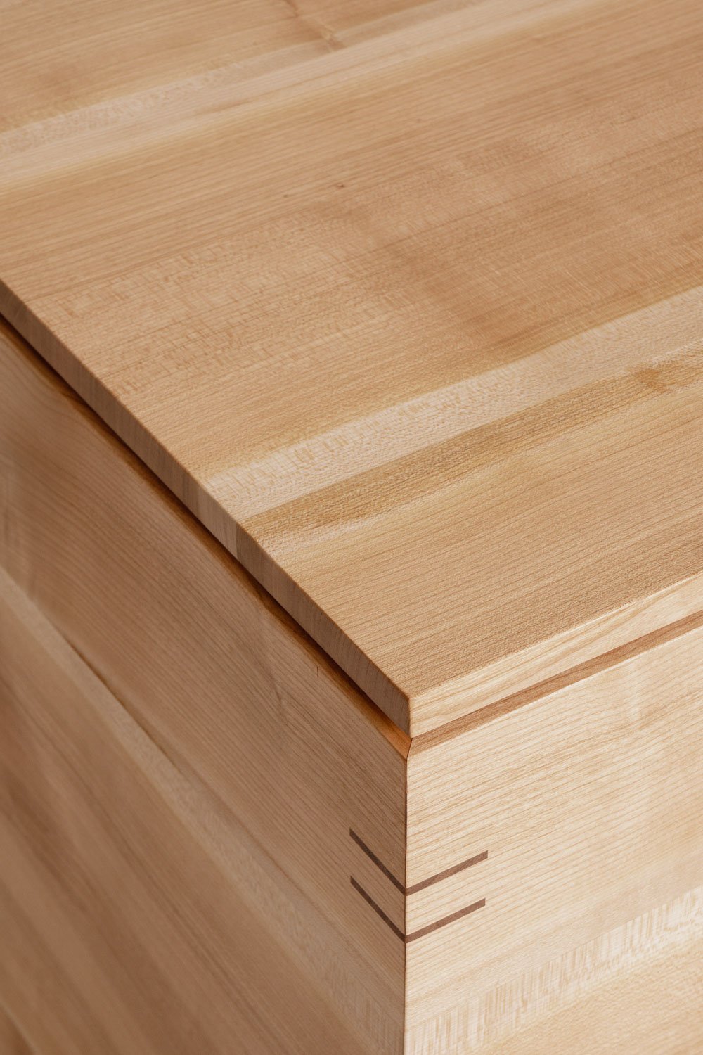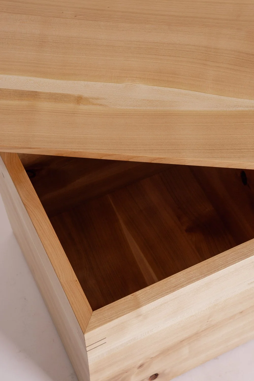 Die Aufbewahrungstruhe, gefertigt aus Schweizer Kirschbaumholz, fügt sich durch die schlichte Formensprache ganz natürlich in jede Wohnsituation ein. Die Ecken sind auf Gehrung verbunden und und mit eingelassenem Nussbaumholz verstärkt. So entsteht ein stabiles und doch elegantes Möbelstück, das viele Generationen überdauert.
