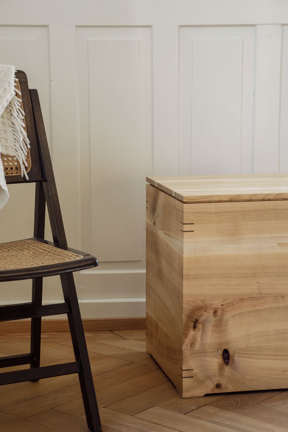 Die abgebildete Truhe wurde aus massivem Schweizer Kirschbaum gefertigt.