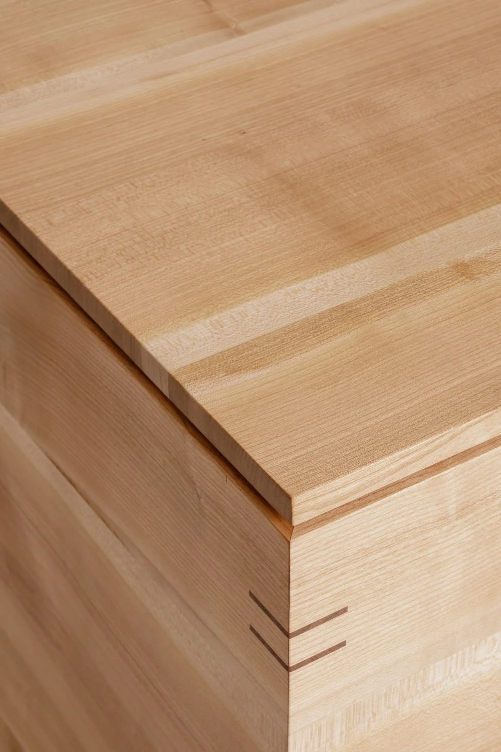 Gefertigt aus Schweizer Massivholz bietet die Truhe praktischen Stauraum und bildet gleichzeitig ein Highlight in jedem Raum. Trotz der massiven Konstruktion wirkt die Truhe leicht und elegant. Die klaren Linien werden bewusst durch Maserung und Äste gebrochen und verleihen dem Möbelstück so das unverwechselbare Aussehen.