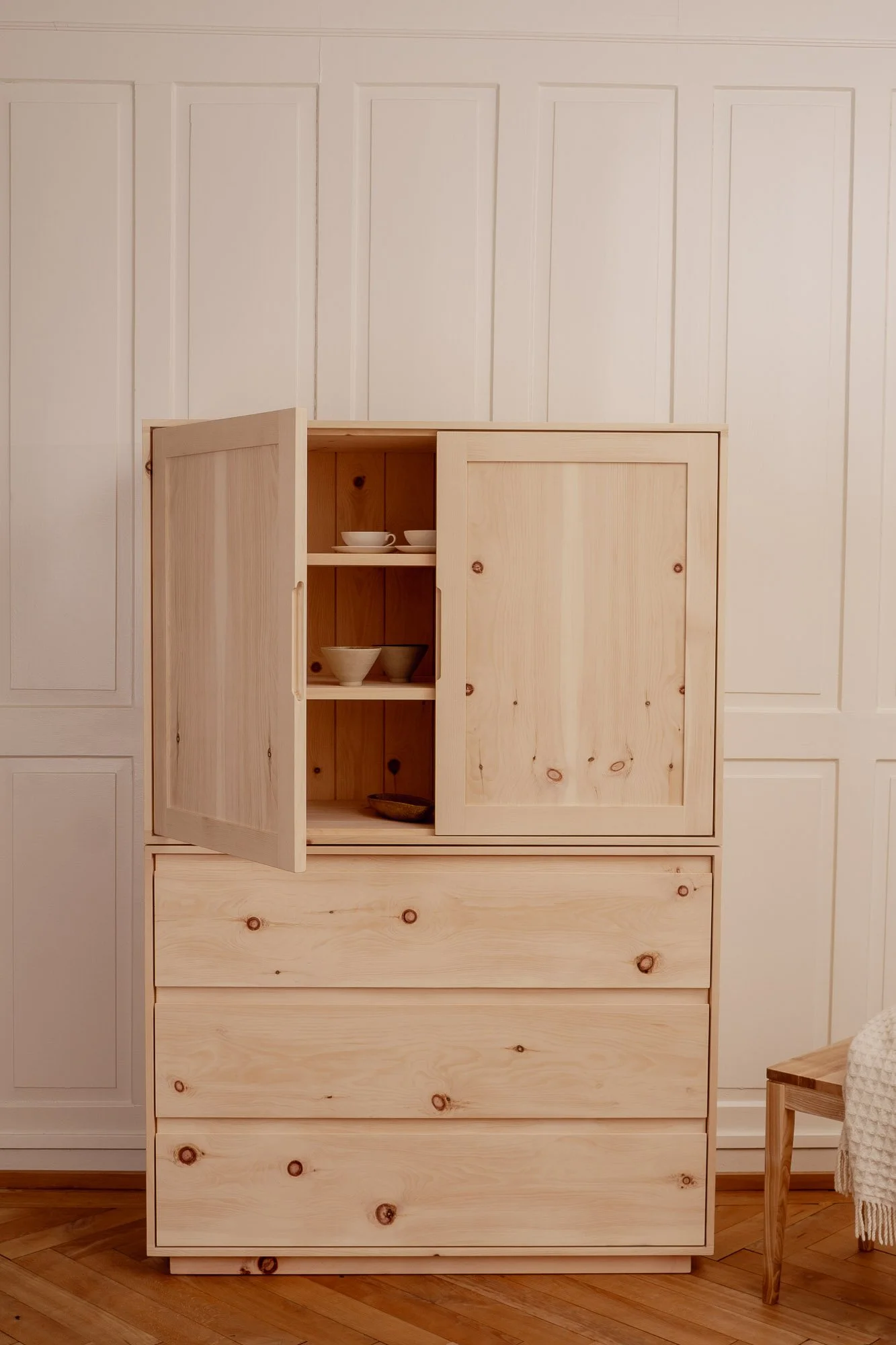 Gefertigt aus Schweizer Arvenholz verbindet dieses Sideboard klare Linien mit traditioneller Handwerkskunst. Das Highlight ist die offene Schwalbenschwanz-Zinkung an allen vier Ecken des Sideboards. Diese klassische Holzverbindung wird mit grösster Sorgfalt per Hand erstellt und verleiht dem Möbel Stabilität sowie Exklusivität.
